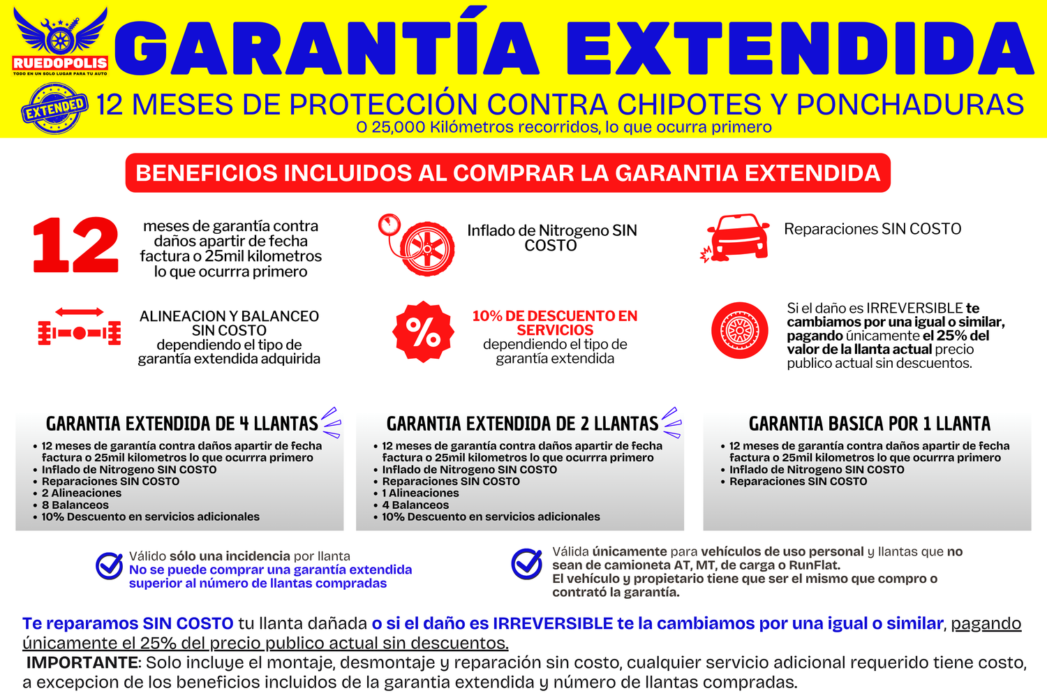 - En caso de que el DAÑO SEA IRREPARABLE y que no sobrepase de los 6,000 Kilómetros (Indicado en el Kilemtraje de la Orden de Servicio o vigencia de 6 meses a partir de fecha factura (lo que ocurra primero) de acuerdo a la marca participante, el usuario debe realizar el pago del 25% del valor actual a precio base sin descuentos para que se le pueda entregar una llanta igual o similar o "equivalente".